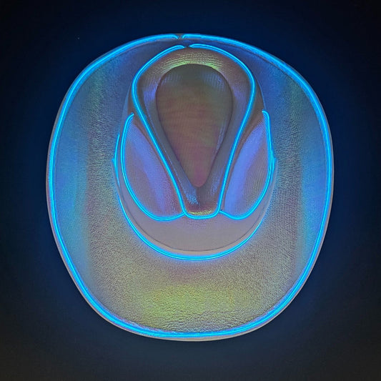 White Iridescent Light Up Cowgirl Cowboy Hat with Bright Blue LED Lights